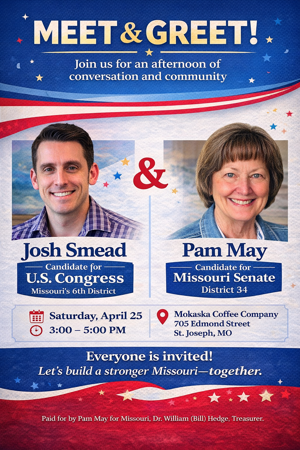 Josh Smead and Pam May Meet & Greet! Join us for an afternoon of conversation and community. Everyone is invited! Let’s build a stronger Missouri – together.